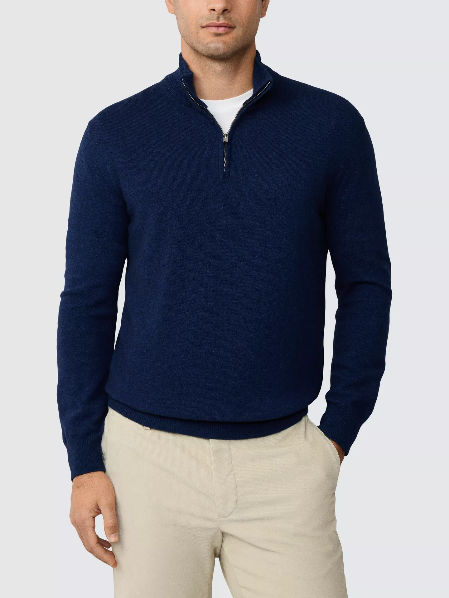 This Hackett London quarter-zip jumper is a refined take on a classic menswear staple, designed with both comfort and polish in mind. Crafted from a luxurious merino wool and cashmere blend, it feels exceptionally soft while still offering warmth and structure. The quarter-zip neckline adds a subtle point of interest, giving the jumper a smart, versatile finish that feels considered rather than casual.